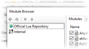 By default, there will be two repositories: “Internal”, which lists modules compiled into the program, and “Official Lua Repository”, which lists modules synced from the Official Lua Repository.